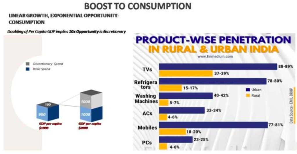 Consumption Boost. With the rising per capita income, there is going to be a massive boost in discretionary consumption, especially in rural India. There is a large scope for spending on these discretionary items as shown by the following data