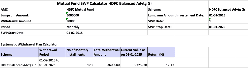 Imagine you invested Rs 50 lakhs (as a lump sum) in the HDFC Balanced Advantage Fund (Growth) on January 1, 2015, for a 10-year period. Starting from February 1, 2015, you withdrew Rs 30,000 (@ 7.2% of the invested corpus on an annual basis) every month as part of a systematic withdrawal plan. By the end of 10 years, you would have withdrawn Rs 36 lakhs, and the valuation of the remaining units in the fund on January 1, 2025, was Rs 93.25 lakhs, boasting an impressive annualized return of 12.42%. (Monthly cash flow along with capital gains can be seen here)